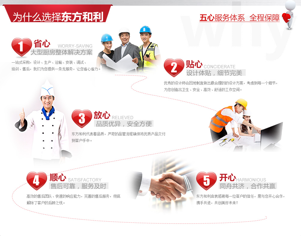 廚房工程建設是一項龐大復雜的系統工程,既需要與后勤工作人員、廚師溝通協調, 又要與土建、裝修、機電、暖通等工程人員相互配合,工作量十分巨大。同時還要采購眾多的食品機械、工具,這對沒有相關經驗的我們來說確實是一個挑戰。有時候我們面對廚師提出的長長的采購需求清單就已經眼花繚亂了。 幸好東方和利提供的是整體解決方案,從前期的設計咨詢到后期的安裝調試、從大型設備到餐具小件,包括各種食品機械,排煙通風,這些瑣碎事情都由東方和利來完成,為我們提供量身定制的解決方案。一站式采購為我們節省了大量精力,而且所有廚具都由東方和利來保修,對我們來說也更加方便。總之,東方和利的服務讓我們非常省心,我很滿意。